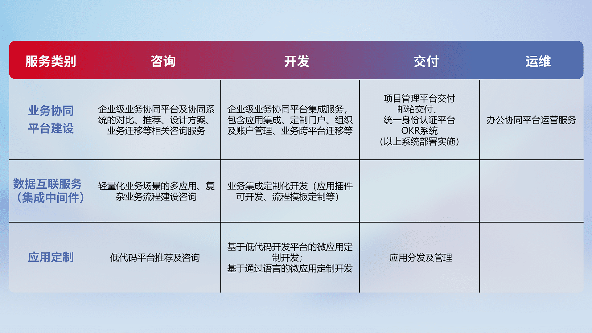 针对钉钉、、企微、、IDaas等平台级产品提供产品的规划、、、、方案、、、交付、、、定制化开发等服务,,,实现如统一协同办公、、、智能客户服务、、混合会议管理、、智能数据查询、、、、等业务场景,,,,实现数字化转型。。